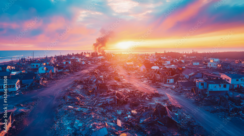 Concept: Coastal disaster; A town ravaged by an event at sunset #1436653308