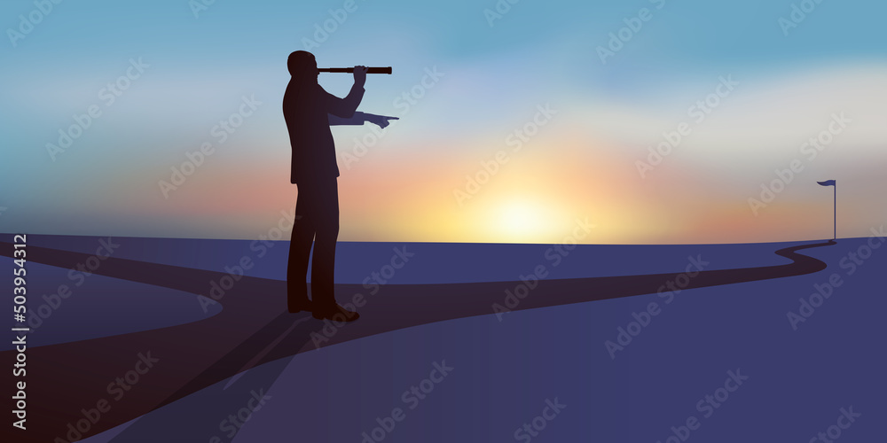 Concept de la prise de décision et du leadership, avec le symbole d’un homme qui choisi une orientation en regardant au travers d’une longue vue. #503954312