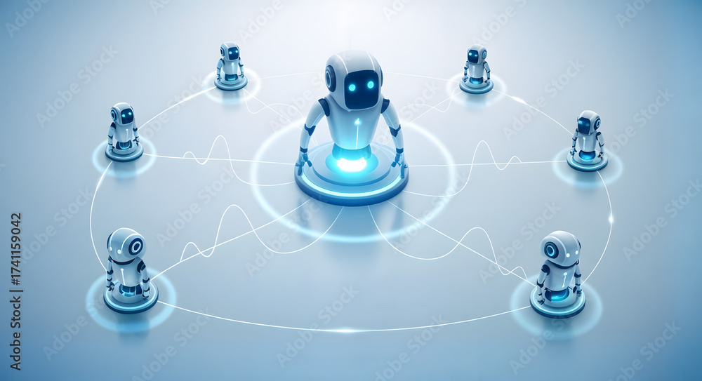 Concept of a multi-agent system or AI teamwork. A central robot leader communicates with a decentralized network of autonomous bots via wireless signals. #1741159042