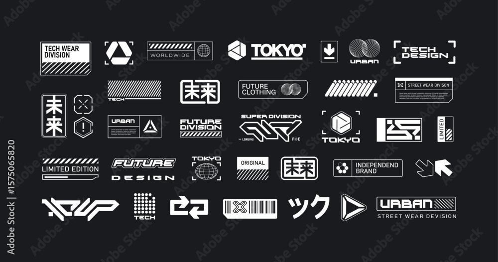 Concept of abstract sci-fi logotypes, futuristic signs with text, cyberpunk geometric elements, techno style hieroglyphs inscriptions for wear fashion and clothing printing - editable vector #1575065820