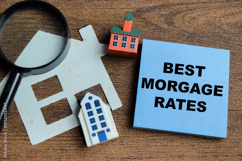 Concept of best mortgage rates write on sticky notes isolated on Wooden Table. #1916105497