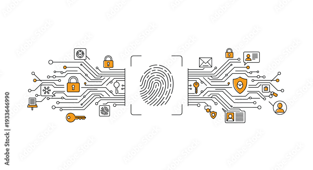 Concept of biometric security featuring a fingerprint scan center stage connected to a network of digital security icons and circuit lines. #1933646990