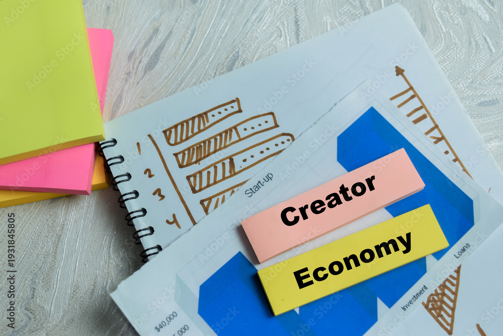 Concept of creator economy write on sticky notes isolated on Wooden Table. Representing independent monetization and community driven growth #1931845805