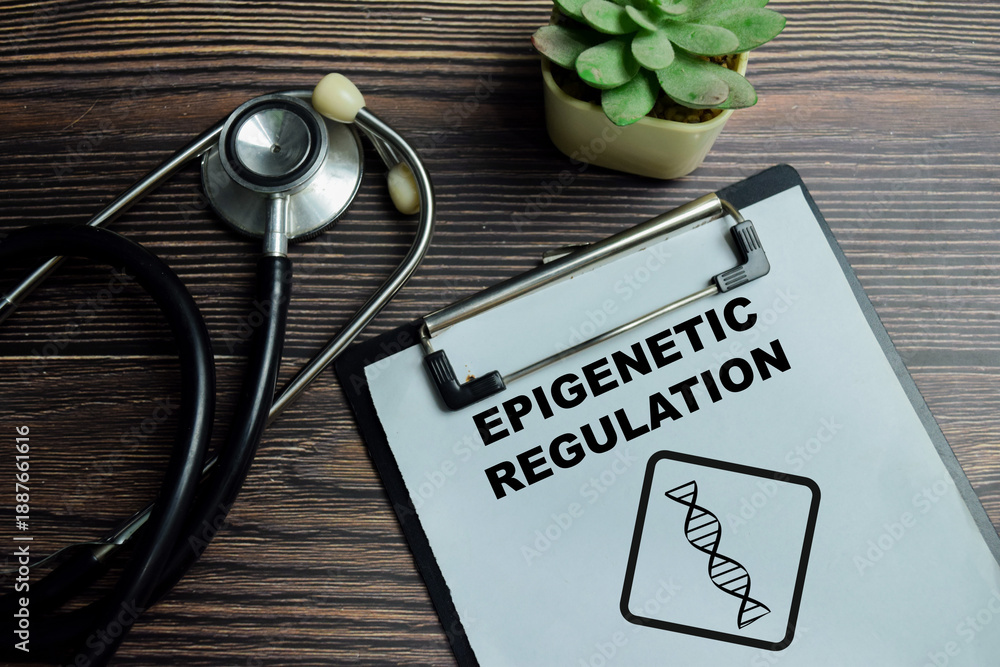 Concept of epigenetic regulation write on clipboard isolated on Wooden Table. Histone modification and environmental influence on genome activity #1887661616
