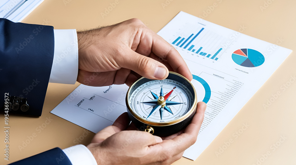 Concept of Strategic orientation in business or marketing. Purpose and direction in business. Compass in the hands of a businessman #1954369572