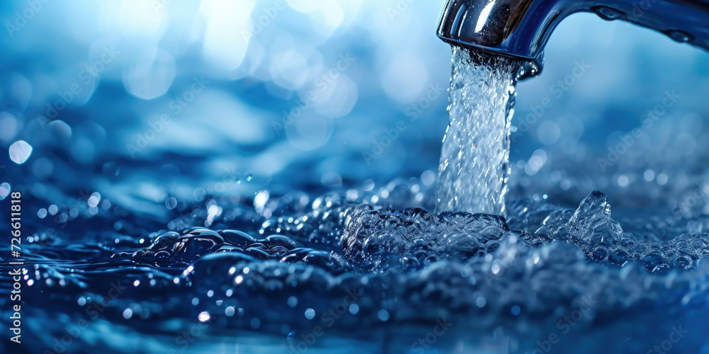 Concept water saving at home, reducing use. Water supply problems. Water a fresh blue tap with flowing water with spray in bathroom. Selective focus #726611818