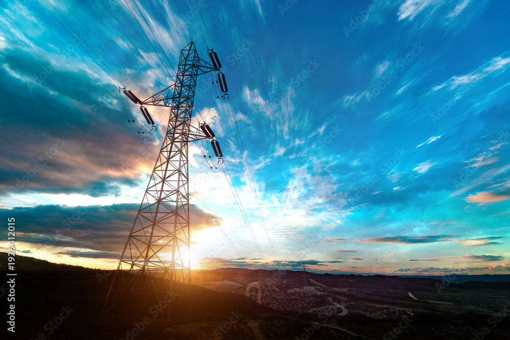 Concepto de energía y electricidad.Torre de alta tensión al atardecer. Líneas eléctricas y distribución energética en paisaje natural. #1926412015
