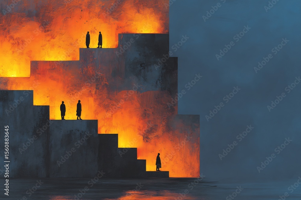Conceptual artwork of social stratification layered structures glowing steps representing privilege levels silhouettes climbing or stuck moody abstract tones #1560883645