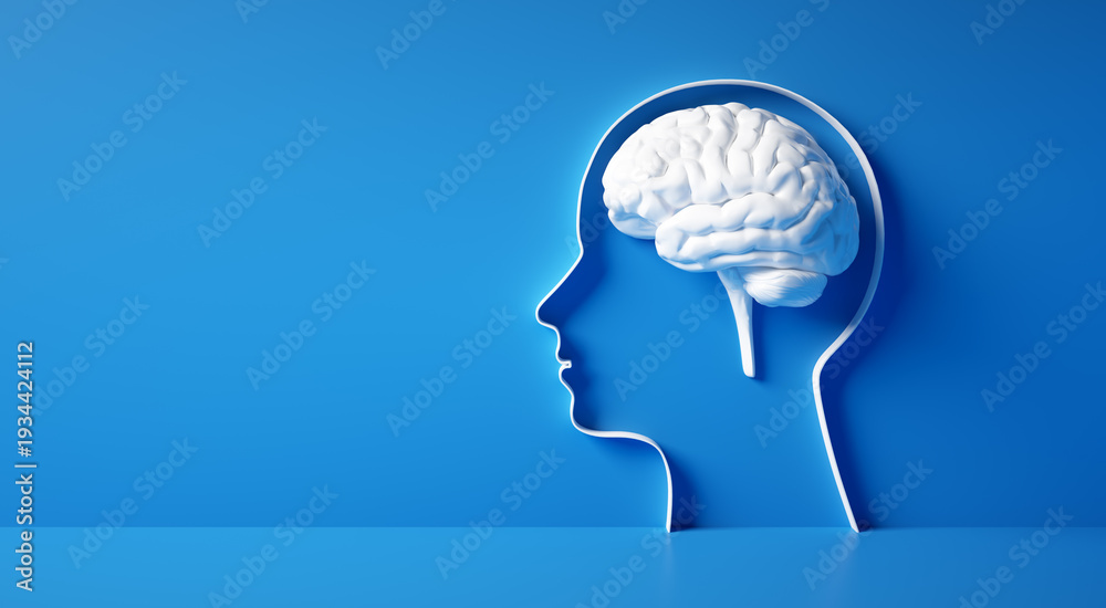 Conceptual artwork showing a 3D silhouette of a head with heap of question marks against blue wall #1934424112