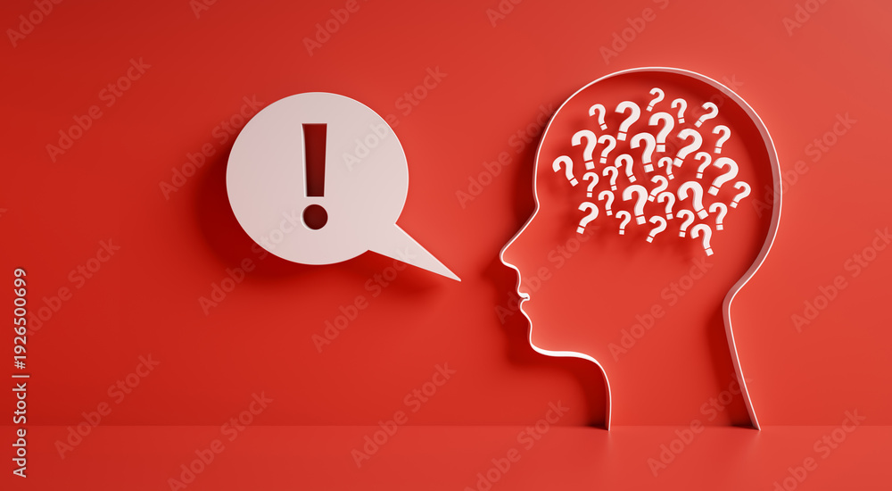 Conceptual artwork showing a 3D silhouette of a head with heap of question marks and speech bubble against red wall #1926500699