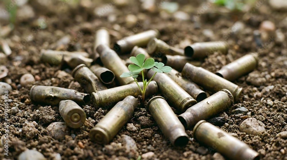 Conceptual image of a small green sprout growing out of spent bullet casings on soil, symbolizing peace and hope #1971059328