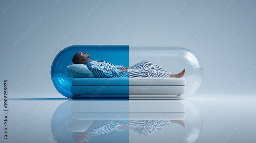 Conceptual image of man sleeping inside a capsule-shaped bed, symbolizing sleep aid or medication #1906253933