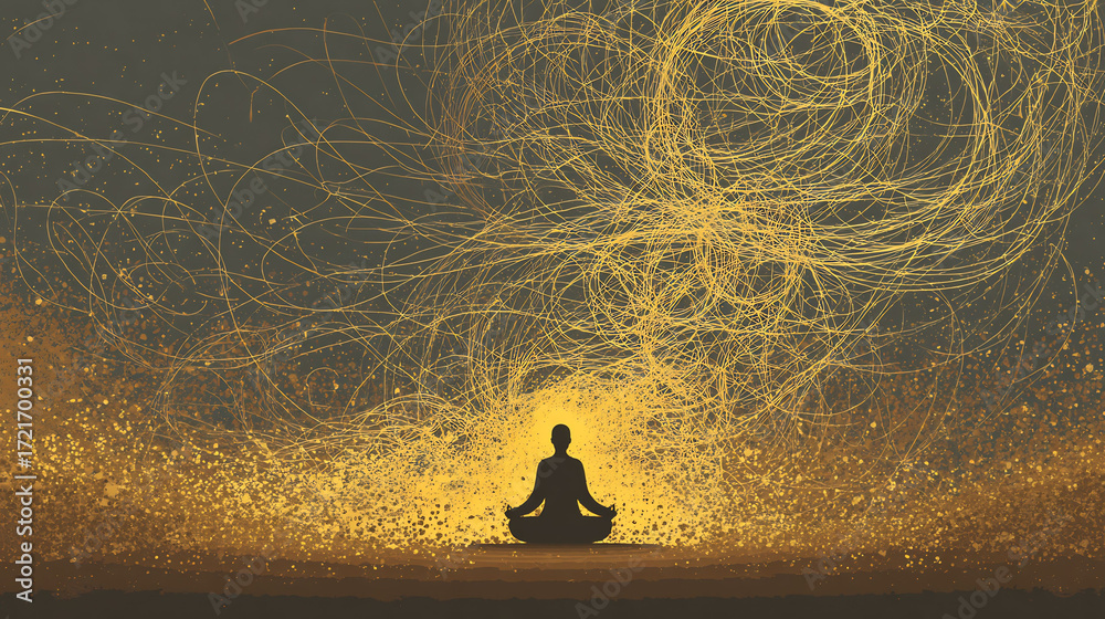 Conceptual psychology art of meditating figure radiating golden light while surrounded by swirling chaos symbolizing mindfulness calm mind and meditation therapy clean abstract illustration no text #1721700331