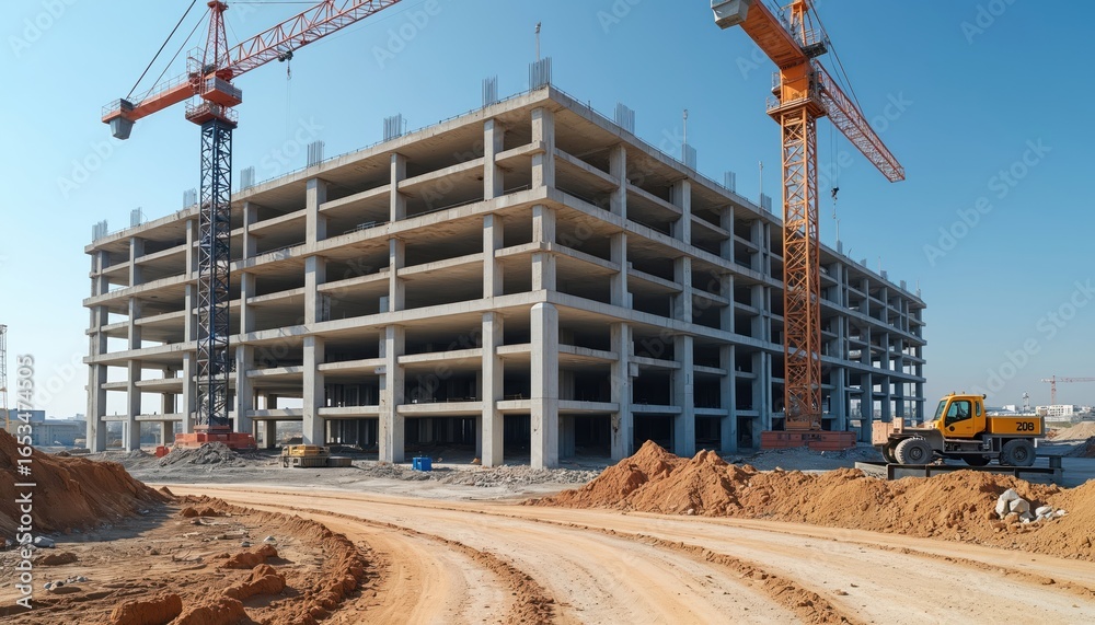 Concrete building frame under construction with large cranes and groundwork. Yellow machinery visible on site. Urban development in progress, showcasing industrial architecture and engineering. #1653474505