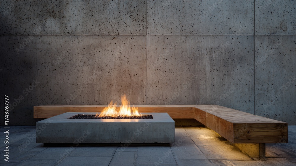 Concrete patio with minimalist fire pit burning brightly, soft reflections on wood bench and speckled concrete wall #1743767777