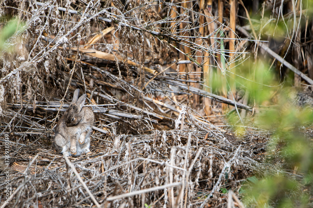Conejo escondido en la maleza y camuflado muy bien. Se queda rezagado para que no o vean, gazapo. #1769180119