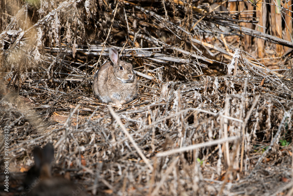 Conejo escondido en la maleza y camuflado muy bien. Se queda rezagado para que no o vean, gazapo. #1769180132
