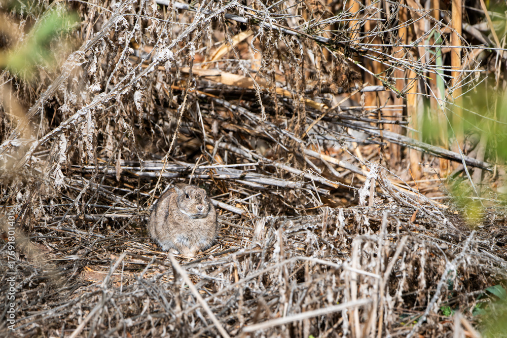 Conejo escondido en la maleza y camuflado muy bien. Se queda rezagado para que no o vean, gazapo. #1769180140