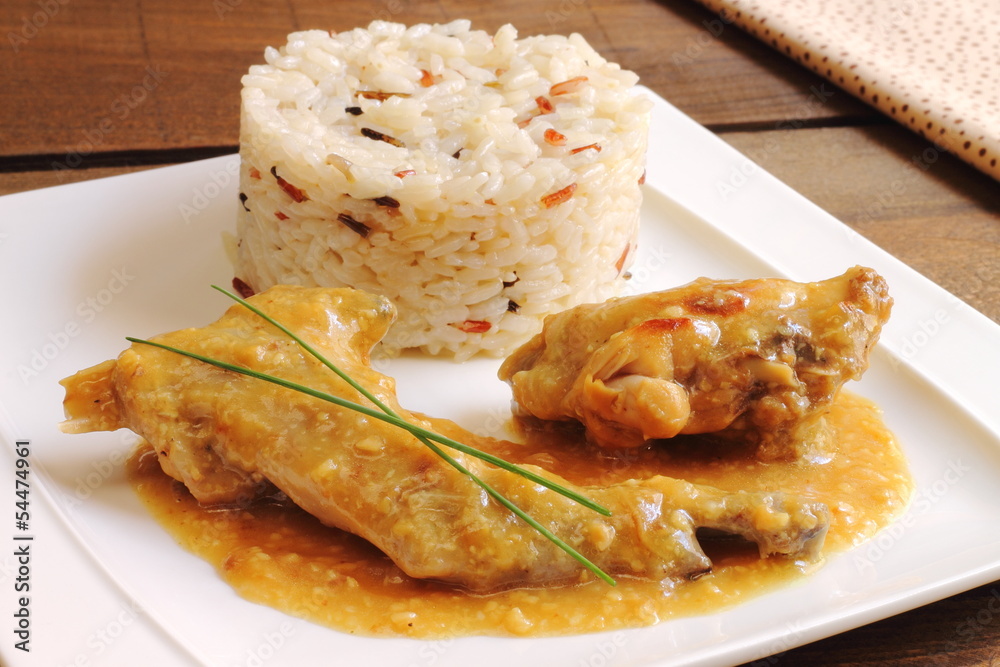 Conejo estofado con salsa de cebolla y arroz #54474961