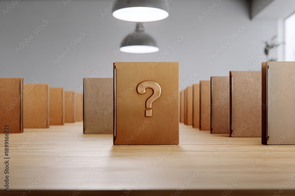 Conference table with rows of identical file holders; the center holder features a question mark symbol in a modern meeting room. #1899166221