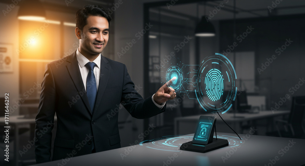 Confident businessman uses futuristic fingerprint scanner for secure access in modern office technology #1711646292
