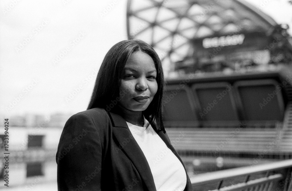 Confident businesswoman posing in modern urban setting, grainy monochrome film aesthetic #1703994024