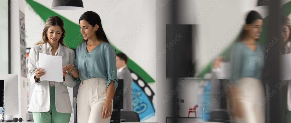 Confident female corporate professional consulting colleague or client on paper document explaining contract terms agreement conditions sharing expertise business ideas standing in modern glass office #1934747918