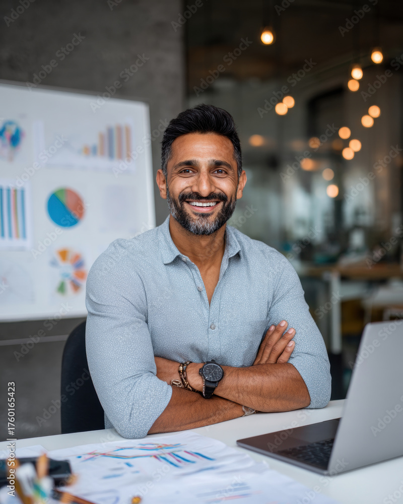 Confident Indian business manager smiling with arms crossed in modern office with charts and laptop, showing success and positivity #1760165423
