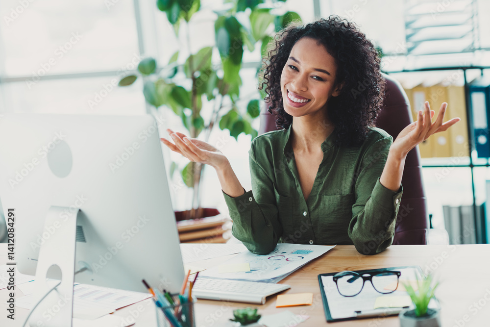 Confident young businesswoman in casual attire smiling at her office desk #1412084291