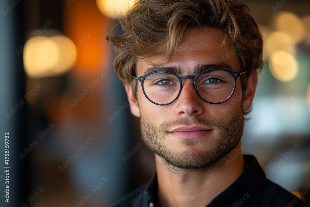 Confident young man with glasses in a modern office setting, showcasing professionalism and readiness while working on business-related tasks, Generative AI #1758159782