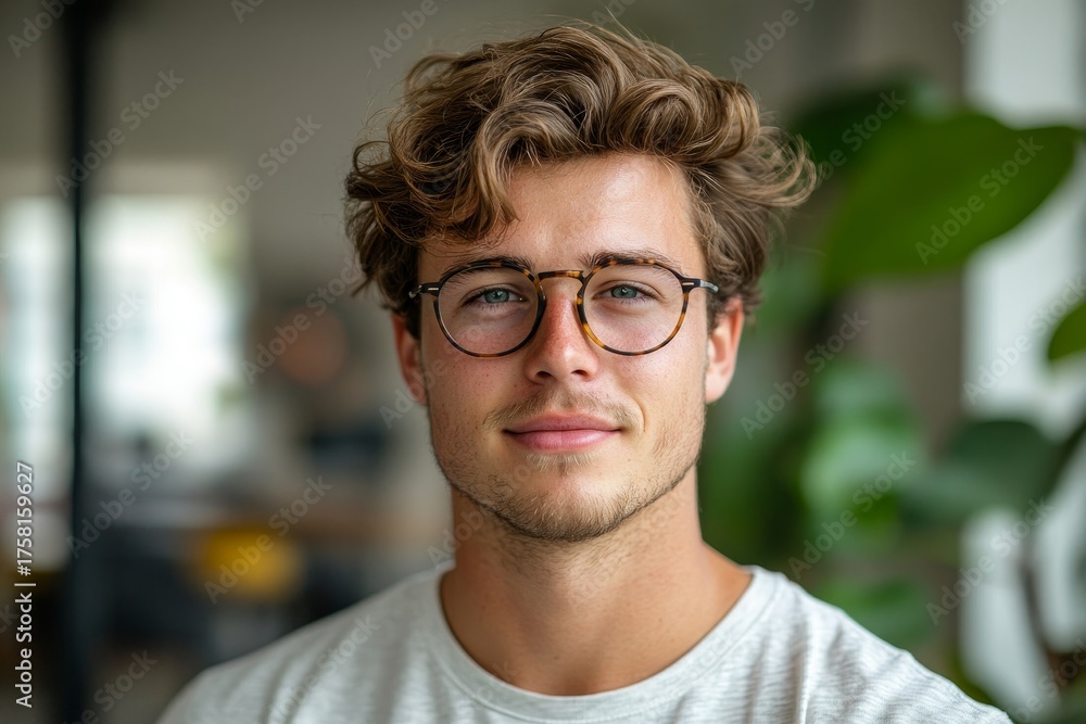 Confident young man with glasses standing and smiling in a modern office environment, expressing positivity and confidence in his professional workspace, Generative AI #1758159627