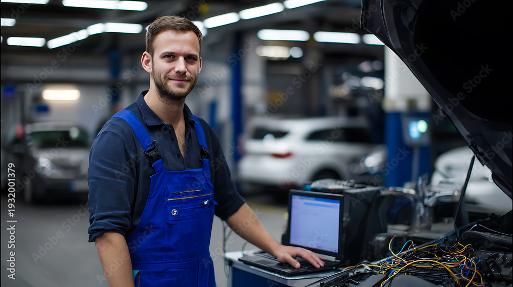 Confident young mechanic in blue overalls smiles while performing vehicle diagnostics with a laptop in a professional auto repair shop #1932001379