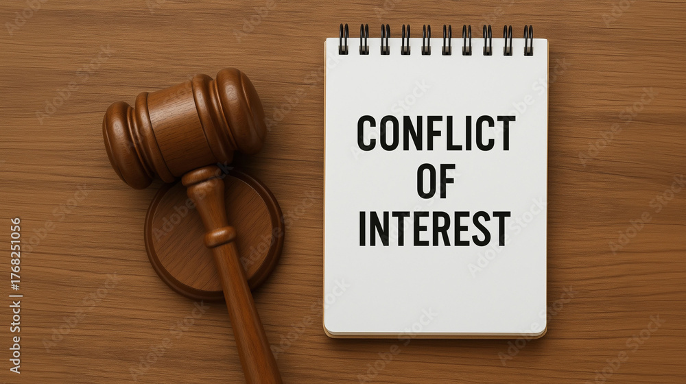 Conflict of interest concept with judge gavel on wooden desk symbolizing ethical dilemma, legal issue, corporate policy, and decision-making responsibility in professional conduct #1768251056