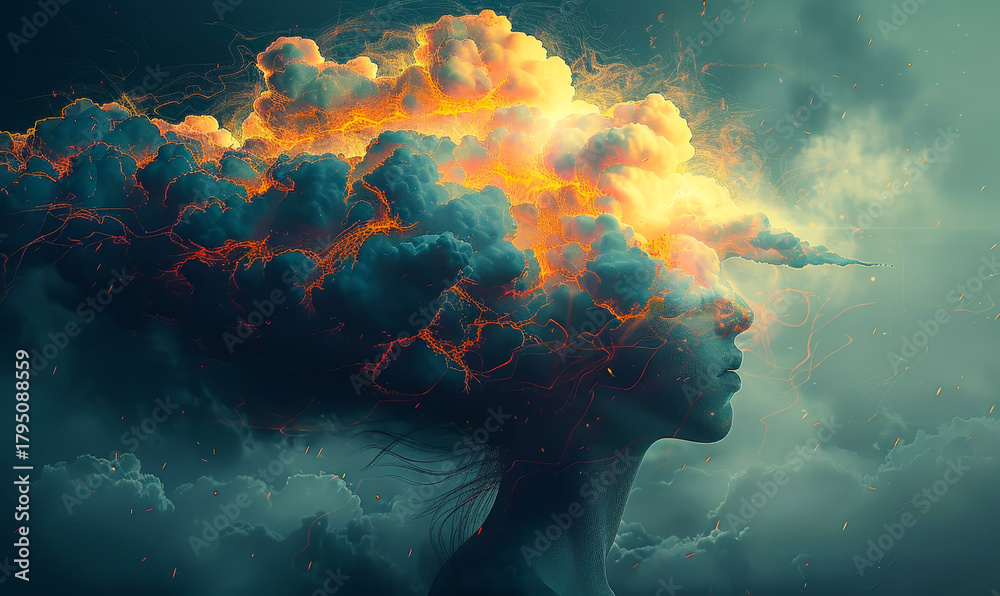 Confusion and Mental Clarity Concept with Foggy Brain: Abstract Illustration of Person with Clouded Mind in Dark Setting, Representing Psychological and Cognitive Challenges #1795088559
