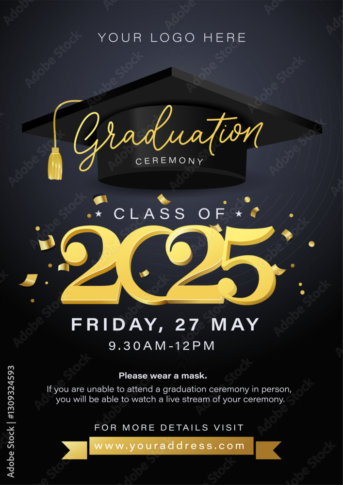 Congratulations graduates elegant banner or greeting card with gold confetti, lettering, graduation cap and diploma scroll. Graduation design for party, yearbook. Class of 2025 vector illustration. #1309324593