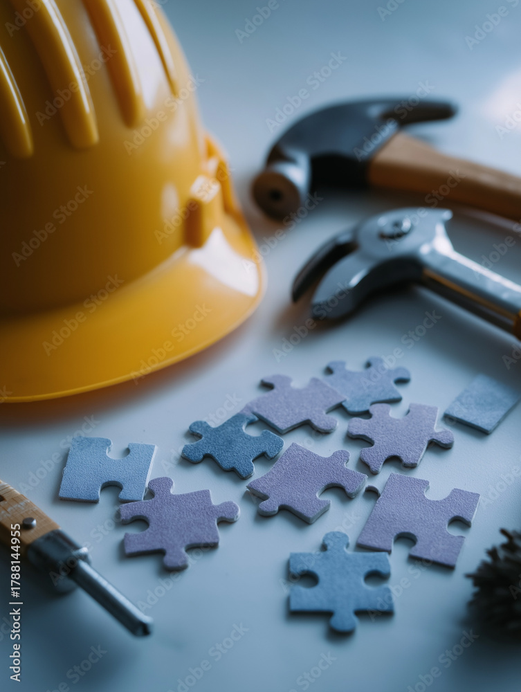 Construction Concept: A collection of essential construction tools, including a yellow helmet, hammer, wrench, and jigsaw puzzle pieces. #1788144955