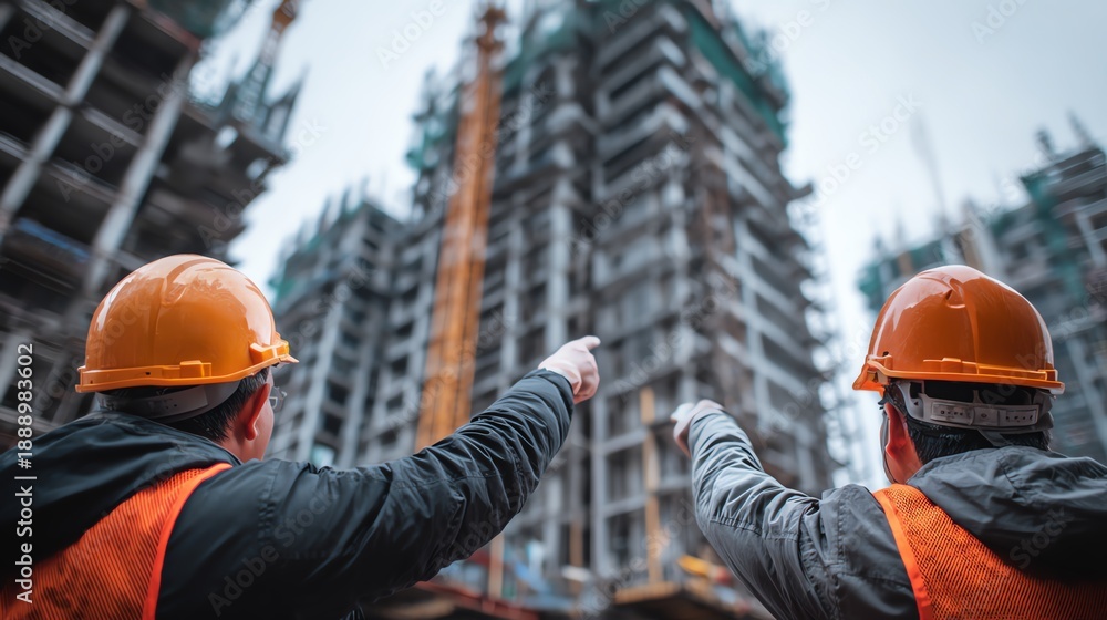 Construction Insight: Two construction workers, adorned in protective helmets and vests, intently assess a towering high-rise building under construction. #1888983602