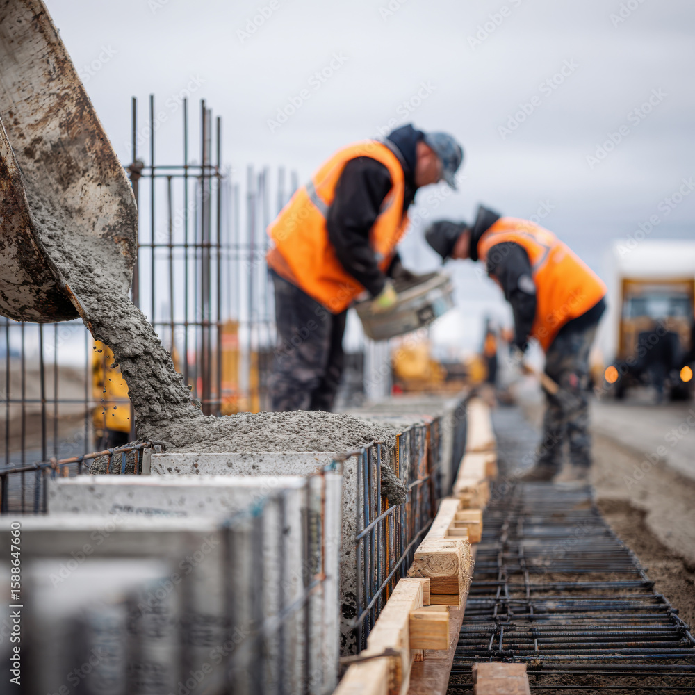 Construction site with workers pouring concrete for security fence foundation, emphasizing protection, access control, architecture planning, and house boundary under construction outdoors #1588647660