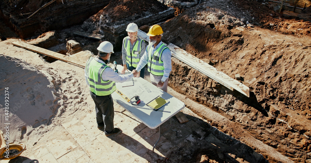 Construction team, handshake and engineer people in partnership outdoor with foundation blueprint. Men, women or above employees with deal for excavation, agreement or architecture with shaking hands #1478092374