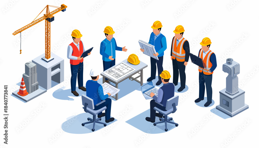 Construction team meeting with blueprints and laptop, isometric illustration of engineers planning a building project with a crane. #1840773841