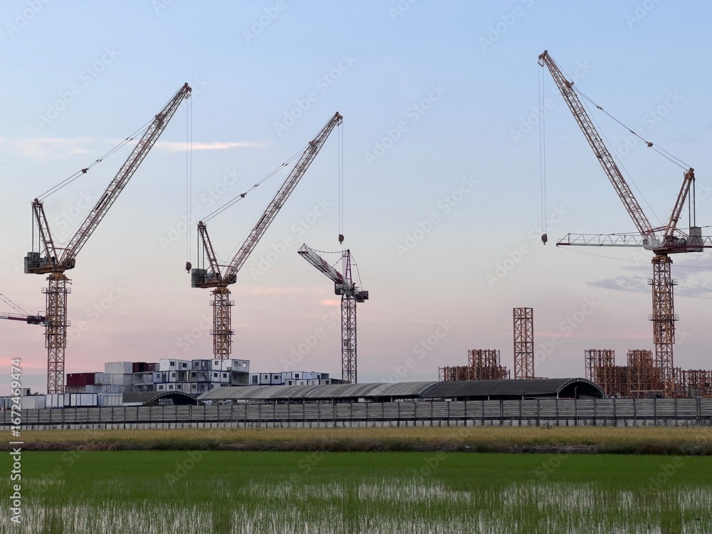 Construction tower cranes on a farm site. Yellow construction tower crane isolated on blue sky with white clouds background and front have farm rice. #1672469474