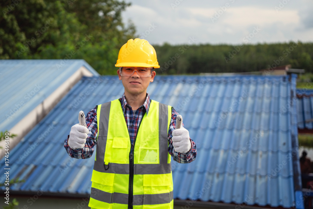Construction worker celebrates roof completion at industrial site outdoor setting professional environment close-up view #1745496100