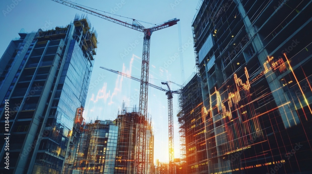 Construction workers and cranes at a modern building site during sunset in an urban landscape #1384530191