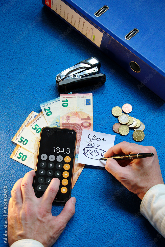 Contabilidad, finanzas y cuentas con calculadora, dinero cash y apunte contable de financiero #1924932620