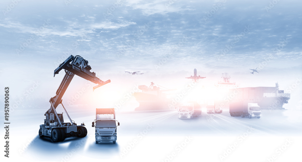 Container truck in ship port for business Logistics and transportation of Container Cargo ship and Cargo plane for logistic import export and transport industry concept #1957890063