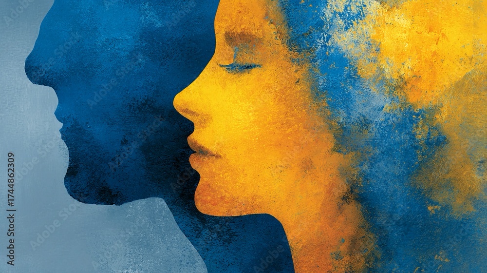 Contemplative portrait with a serene mood in modern blue and gold abstract, perfect for artistic projects or conveying introspective themes #1744862309