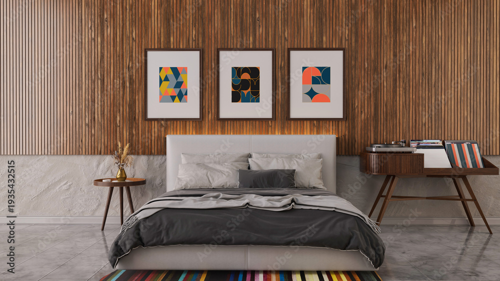 Contemporary bedroom with wood and concrete wall 3D render #1935432515