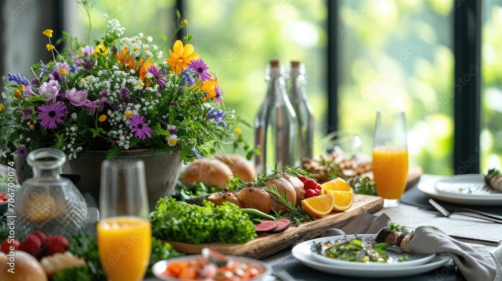 Contemporary Easter brunch setting emphasizing healthy eating, with organic vegetable dishes, freshly squeezed juices, whole grain breads, and a centerpiece of edible flowers and herbs #706700074