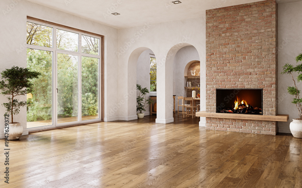 Contemporary living room with natural materials, arched walls, large windows and a minimalist fireplace, 3d render #1947629372