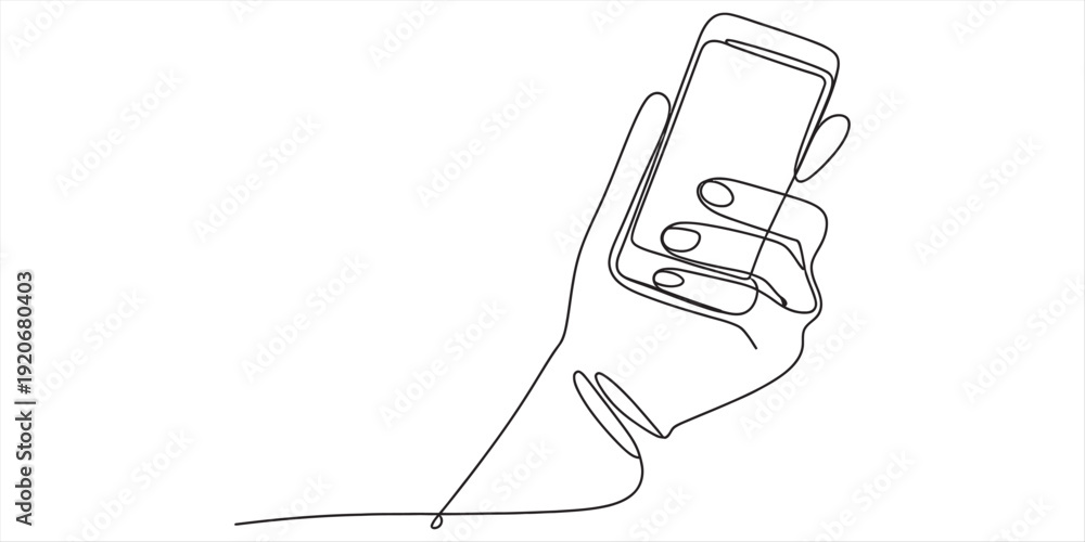 Continuous line drawing of a hand holding a smartphone on a white background Vector, illustration #1920680403